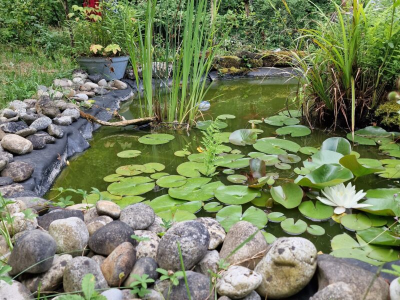 Hier ist ein alter Bestandsgarten in der Umgestaltung von der klassischen Rasenfläche hin zu mehr Vielfalt und kleinen Biotopen. Großen Charme versprüht dabei der alte Baumbestand, in dem sich auch Specht, Blindschleiche und anderes „Getier“. Tolles Beispiel, wie aus dem alten Kindersandkasten mit einfachen Mitteln ein Teich gestaltet werden kann.