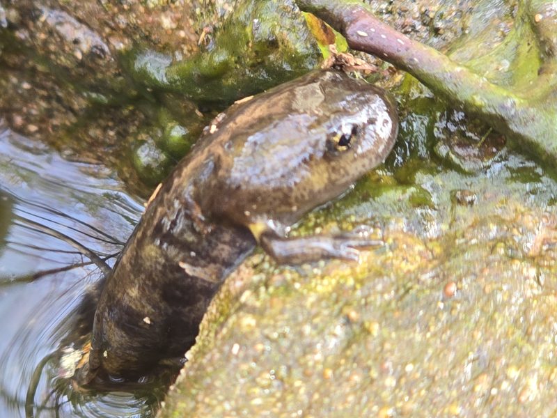 Was aber ebenso in vollem Gange ist, ist der Nachwuchs der Amphibien – hier auf dem Bild ein kleiner geretteter Feuersalamander. Dieser ist aus Versehen voller Schwung aus seinem Schwimmbecken befördert worden und wurde nach kurzem Umherirren wieder eingefangen und zurück gesetzt. Kurz hat er sich auf dem Becken ausgeruht, bevor er wieder im kühlen Nass entschwunden ist.