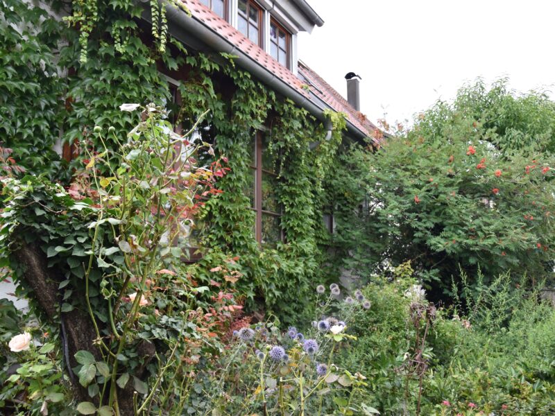 Schon beim ersten Blick auf das Haus fällt die üppige Fassadenbegrünung mit Efeu und Wildem Wein ins Auge – alles ist grün, und es summt und brummt lebendig an der Wand. Hinter dem Haus öffnet sich ein naturnaher Garten mit vielen wilden Ecken, Nisthilfen für Insekten und Vögel sowie einem Teich und weiteren Wasserstellen. Offenes Totholz ist als Polter hinter der Garage gestapelt und über bewusst offen gehaltene Wege erreichbar. Kaum eine Fläche bleibt unbewachsen, und die Vielfalt der Pflanzen ist beeindruckend. Dieser Garten zeigt eindrucksvoll, wie auch mitten in der Stadt ein lebendiger Lebensraum für Mensch und Tier entstehen kann.